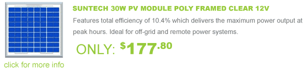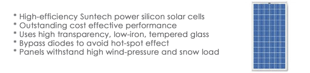 SunTech Solar PanelsSuntech is a Chinese company that produces crystalline silicon solar panels. They have a large construction facility located in the Wuxi province and also have offices in most major solar markets. They produce a solid solar panel using the tried and true technology of crystalline silicon. Suntech solar panels currently feature solid and dependable technology, but that should not lead you to believe that suntech is not interested in innovation. They have a highly qualified research team with more than a century's cumulative experience in solar power that is committed to improving their already solid technology. Suntech is researching things from multi junction cells to thin film or string ribbon technologies. They won't adopt a new manufacturing technique just for the sake of being new; they want to ensure that it is a step up that is worth investing in. That type of sustainable development is what will ensure that Suntech is a viable company for years to come. Suntech's monocrystalline photovoltaic panels feature total efficiency of 7.6% which delivers the maximum power output at peak hours -- ideal for off-grid and remote power systems. With a 25-year warranty, the module has high efficiency and long-lasting operating time even in a variety of rigorous conditions.